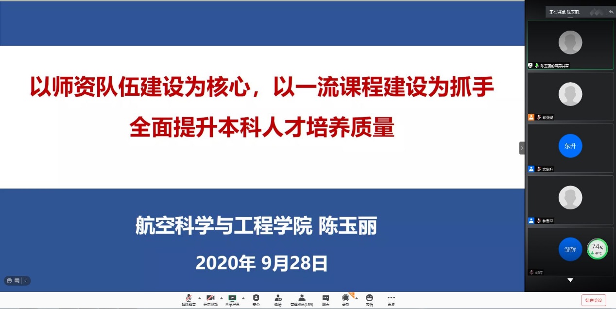 副院长陈玉丽做了题为《以师资队伍建设为核心,以一流课程建设为抓手 全面提升本科人才培养质量》的报告。主要汇报了人才培养理念和方式的变化、全面提升人才培养质量和本学年重点工作三方面内容。她指出培养模式从专业型人才培养向复合型人才培养转变,培养方式也要随之转变,概括起来就是要以学生为中心,从专业、课程、教师以及教学成果等多方面提升凯发的人才培养能力。在师资队伍建设方面,继续施行“导师制”,促进青年教师快速成长。在课程建设方面,以一流本科课程建设为抓手,全面推动本科人才培养改革,计划用3年时间,建设四级一流本科课程。已申报国家级一流课程4门,今年拟申报4-5门;第一批立项校级一流课程8门,第二批申报了4门;院级一流课程立项10门,院级培育课程立项13门。在专业建设方面,飞行器设计与工程获批首批国家级一流本科专业建设点,工程力学专业获批首批国家级一流本科专业建设点、强基计划专业,计划申报拔尖计划2.0第二批,飞行器环境与生命保障工程专业正在申报国家级一流本科专业,新增飞行器控制与信息工程专业。陈院长提到,今年本科教学的重点工作主要包括一流课程建设、课程思政、一流专业建设、一流基地建设,继续探索面向未来的创新拔尖人才培养模式。