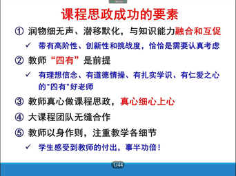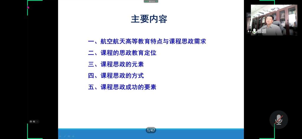特别邀请杨超教授为全院老师做了课程思政建设的专题报告。杨老师结合航空航天高等教育的特点与课程思政的需求,从课程思政的定位、元素、方式和成功要素几方面分享了自己的经验。杨老师提出课程思政应包含“爱国奉献”、“思辨创新”、“职业道德”等元素,由点及面、由分散到系统,还强调教师的“四有”是课程思政成功的前提,只有教师真心、细心、上心,通过润物无声、潜移默化的方式将思政元素融入课程,与知识能力相融合,才能做好课程思政,培养出德才兼备的两领人才。