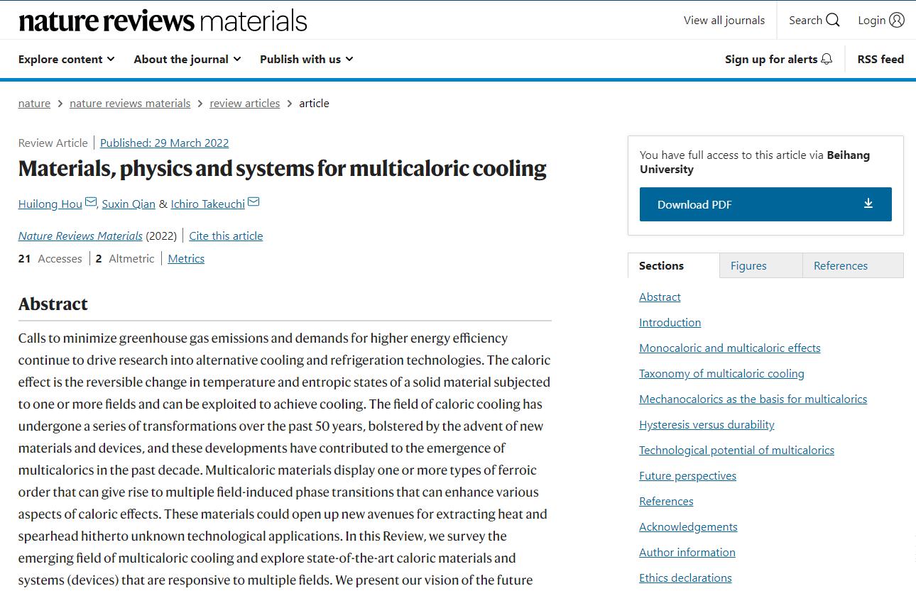 侯慧龙副教授在固态相变制冷领域取得的新进展:《Materials, physics and systems for multicaloric cooling》()。固态相变制冷技术,基于固体材料内禀序参量在外场源下的可逆改变引起材料的吸/放热效应,经热力学循环实现制冷,具有绿色环保、节能高效、低噪稳定等诸多优点,不仅具有巨大的市场经济价值与社会环保意义,而且在航空航天、空间探测等领域也具有重要应用前景。此工作在梳理和归纳了单场以及多场转换与调控固态相变制冷技术的基础上,从材料、物理、系统三个层次进行了原创性的研究工作,实现了场致熵变的联合增效,建立了相变制冷材料的延寿准则,完善了多场功-能转换器件的评价体系。该工作不仅是对单场致效应的归纳与补充,而且丰富和拓宽了多场作用下制冷材料与器件的种类及概念范畴。值得一提的是,所发表期刊《Nature Reviews Materials》的影响因子(IF=66.308),在全球物质类(材料、化学、物理、工程、机械等)研究期刊中,排名第一。该项工作也是北航自建校以来发表在该期刊上的第二篇成果(第一篇由江雷院士于2017年发表)。
