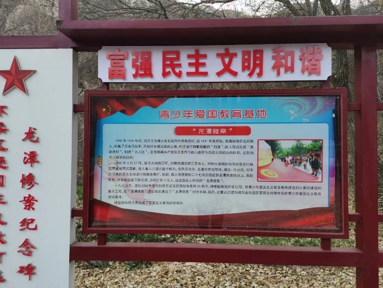 “龙潭惨案纪念碑”则位于神堂峪,其背景是1945年3月27日,驻大地的日军纠集伪满洲军、伪警察、汉奸特务二、三百人,对八道河、交界河、石片等“无人区”地带躲避到深山里的贫苦百姓进行拉网式的野蛮搜捕,烧杀抢掠。敌人将搜捕来的无辜百姓押解到距石片村约有5华里路的龙潭西南侧的坝台上。被抓来的有不满周岁的婴儿,有白发苍苍的老人,还有身怀六甲的青年妇女。敌人强制这些淳朴、善良的平民百姓,站在坝墙根下排成行,面向东跪着。日伪军面向西也站成一队,前面架起机关枪,对准手无寸铁的无辜百姓。在敌人抓捕的27人中,当场死亡15人,受伤4人,8人幸免于难。这就是日本侵略军在怀柔地区制造的集体屠杀民众的“龙潭惨案”。