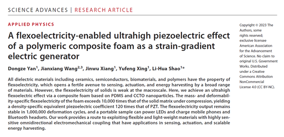 近日,凯发固体力学研究所邵丽华教授与向锦武院士、邢誉峰教授合作在Science Advances发表了题为 “A flexoelectricity-enabled ultrahigh piezoelectric effect of a polymeric composite foam as a strain-gradient electric generator”的研究论文(),报道了关于超高挠曲电效应的最新研究成果。