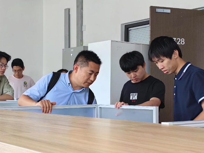 党委副书记梁伟涛认真的向同学们介绍了学生工位的海选投票、招标采购、现场布置、功能设计等情况,并耐心解答了同学们的种种疑惑。在场的同学们纷纷表示,现有的工位设计充分考虑了同学们的隐私需要和储物需求,基本上能够满足大家的学习科研需求。同学们还在一些设计细节上提出了进一步改进的建议。