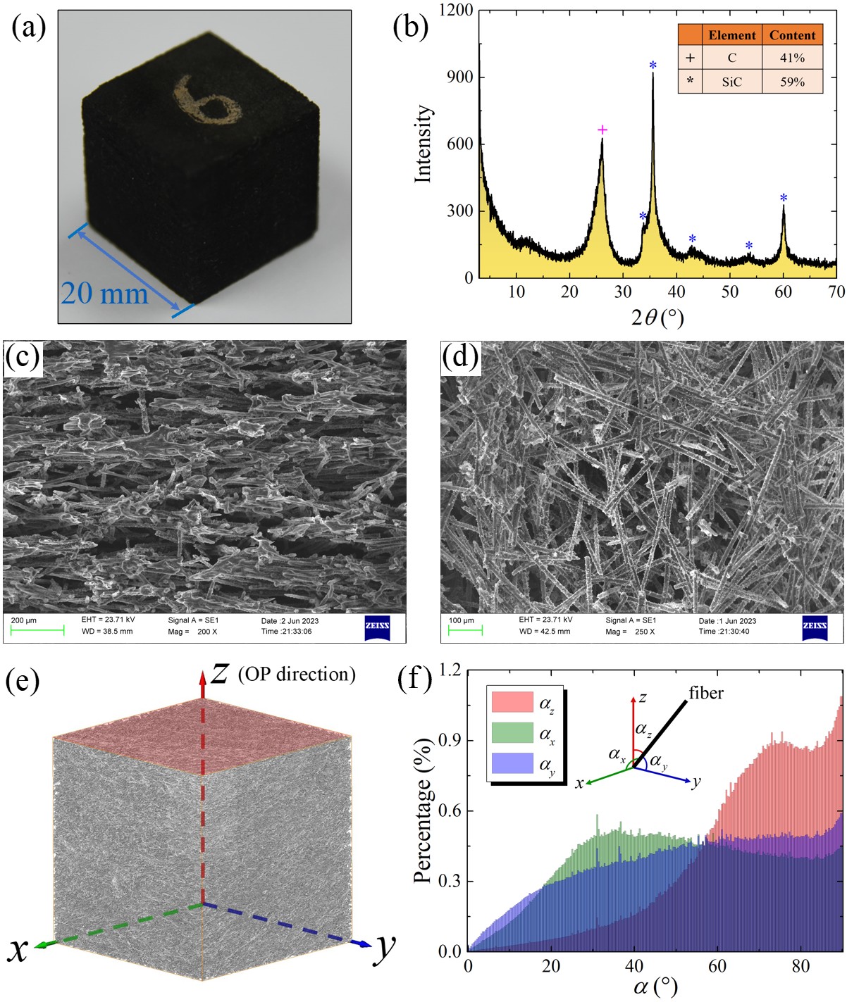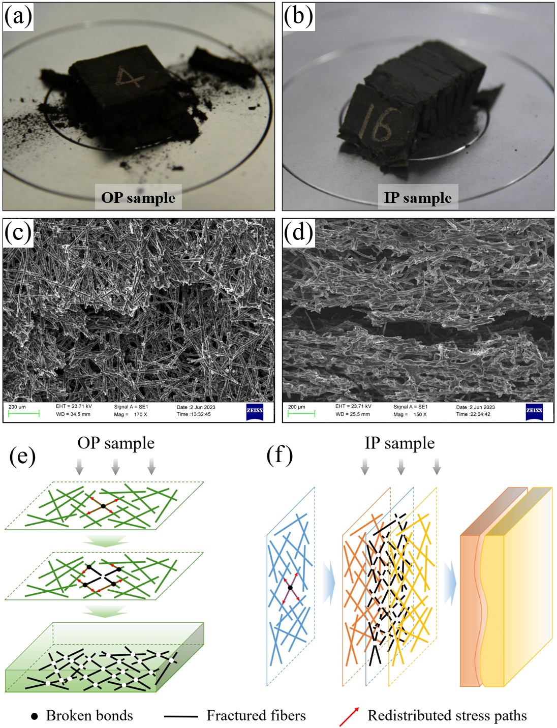 在微观结构观测表征的基础上,课题组规划了一系列准静态压缩实验,以探究SiC-coated CBCFs材料的宏观压缩力学性能及其退化规律。根据内部纤维取向分布特征,压缩实验分别从面外和面内两个方向开展。与未涂层的CBCFs材料相比,碳化硅涂层的引入对材料整体面外和面内方向的压缩模量的提升率分别达到178.67%和86.82%,强度提升率分别为56.25%和38.86%。该研究考察了材料宏观和微观尺度上的损伤和失效形式,分析了不同类型样品的失效特征与纤维取向分布之间的内在联系。