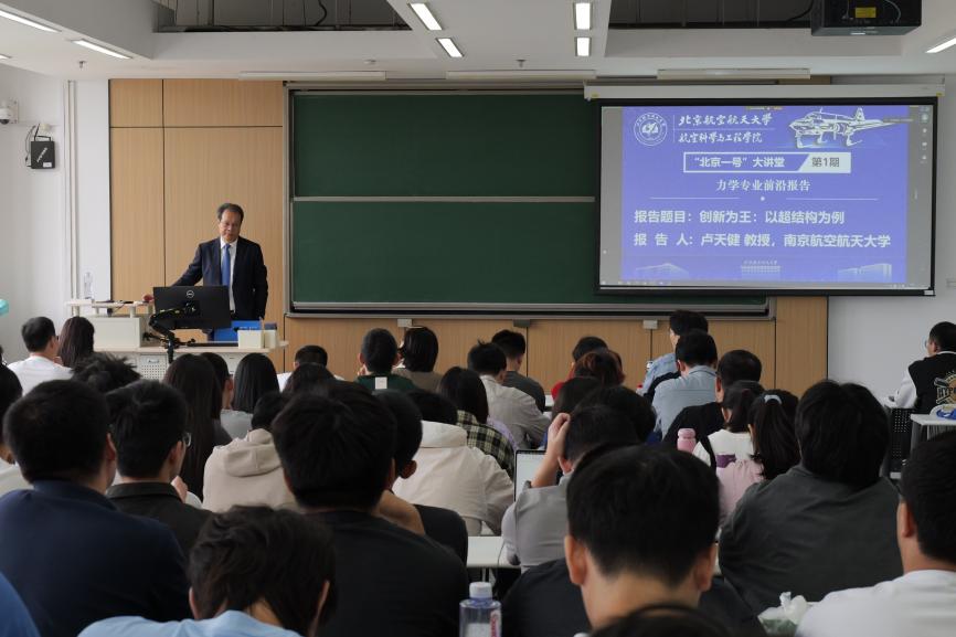 “北京一号”大讲堂之力学专业前沿报告、人机与环境工程专业前沿报告在沙河校区4号教学楼顺利举办。“北京一号”大讲堂聚焦科技前沿与工程需求,引领航院学子体悟大科学观念、大工程视角、大先生风范,以期传承北航先辈“空天报国、敢为人先”的“北京一号”精神。新学期第一讲中,邀请到了南京航空航天大学卢天健教授、航天五院总体部苗建印研究员主讲。