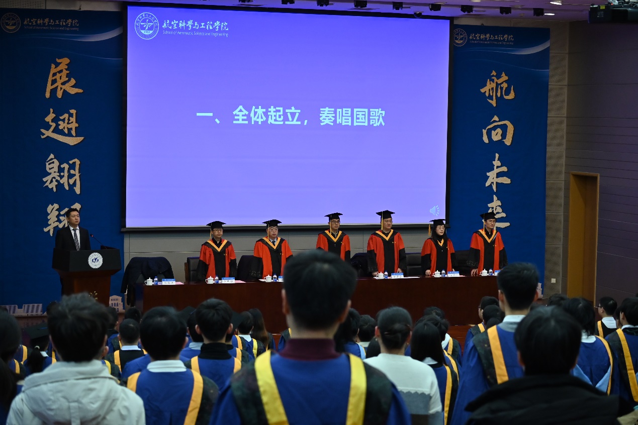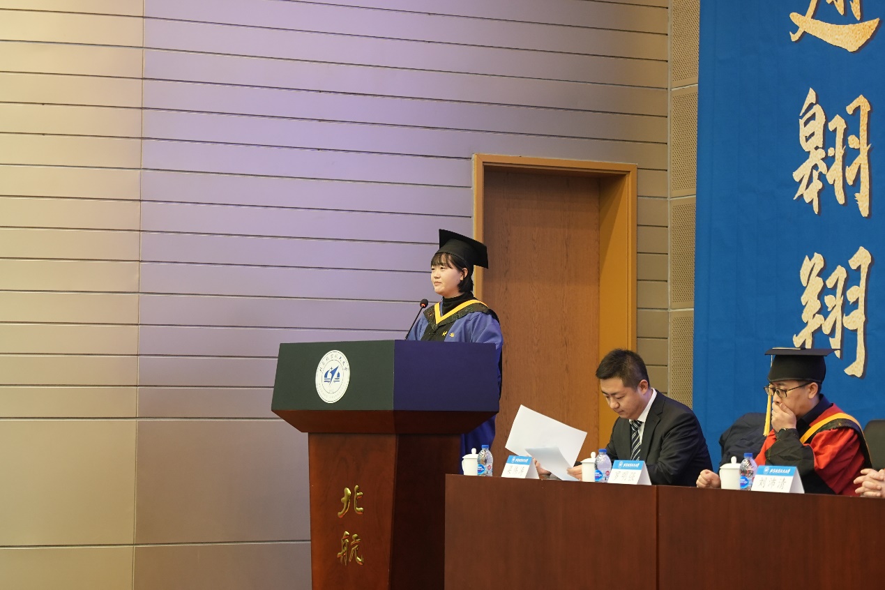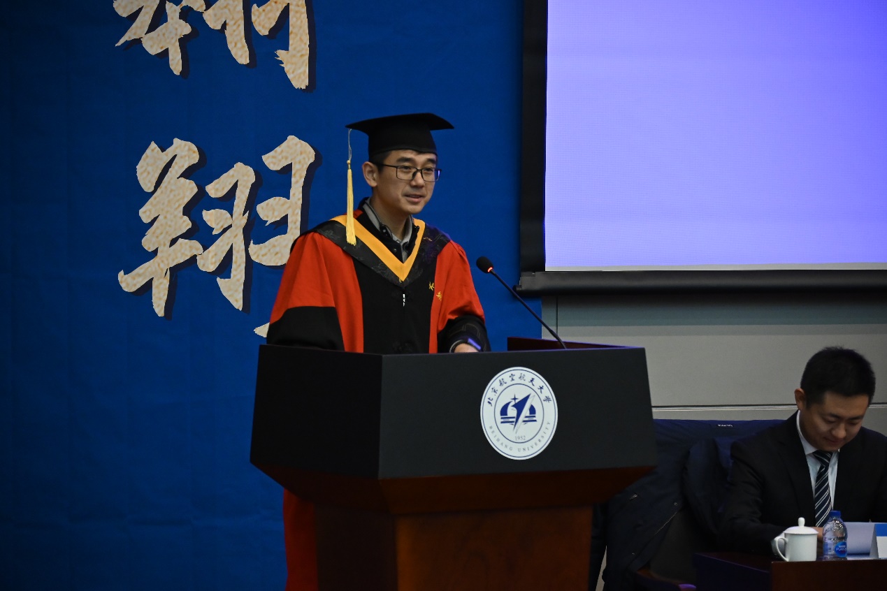 祝贺同学们顺利毕业,并寄语2025届毕业生,期待大家远走高飞,一飞冲天。对于未来的人生航程,潘院长提出三点期望,激励2025届研究生毕业生。一是要胸怀梦想。潘院长分析了近期的国际形势并指出,只有拥有强大的空天国防力量才能维持安定的社会局面,希望毕业生胸怀梦想,不论从事什么行业都不失去空天报国的理想本色。二是要坚定信念。潘院长分享了近期去扬州研究院的调研经历,以及校友的亲身经历,勉励毕业生坚定信念,在受到挫折时保持初心梦想,发扬北航人骨子里“不服输、不怕苦、不信邪”的精神。三是要放眼世界。面对目前的国际形势,要有国际视野,不懈努力、不断阅读,使我国的空天技术早日达到世界领先水平。