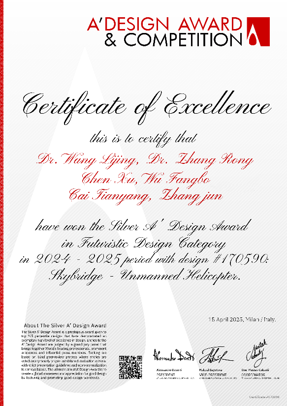 张融团队联合完成的Restbase小睡枕"和"SkyBridge无人直升机"两件作品,在国际顶尖设计创新比赛——意大利A' Design比赛中分别摘得金奖(top 1%)和银奖(top 3~5%),展现了我校在人机创新设计领域的卓越实力。