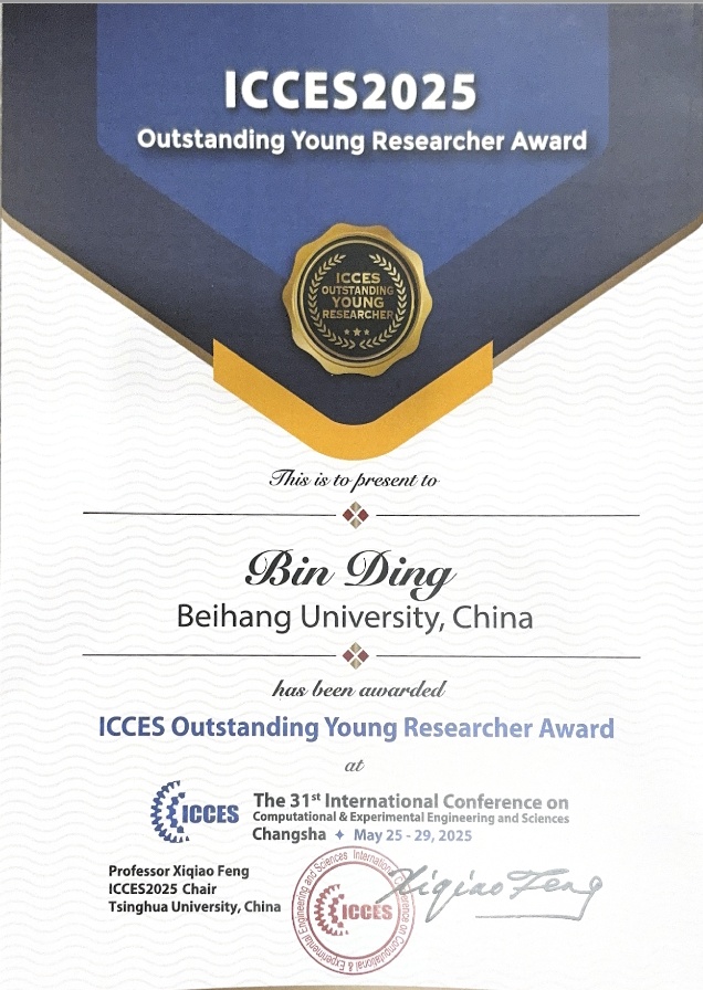 2025年5月25日至29日,第三十一届国际计算与实验科学工程大会(ICCES)在湖南长沙隆重举行。会上,凯发丁彬副教授凭借其在微纳米力学与能源材料力学领域的突出贡献,被授予“ICCES Outstanding Young Researcher Award”(ICCES杰出青年学者奖)。