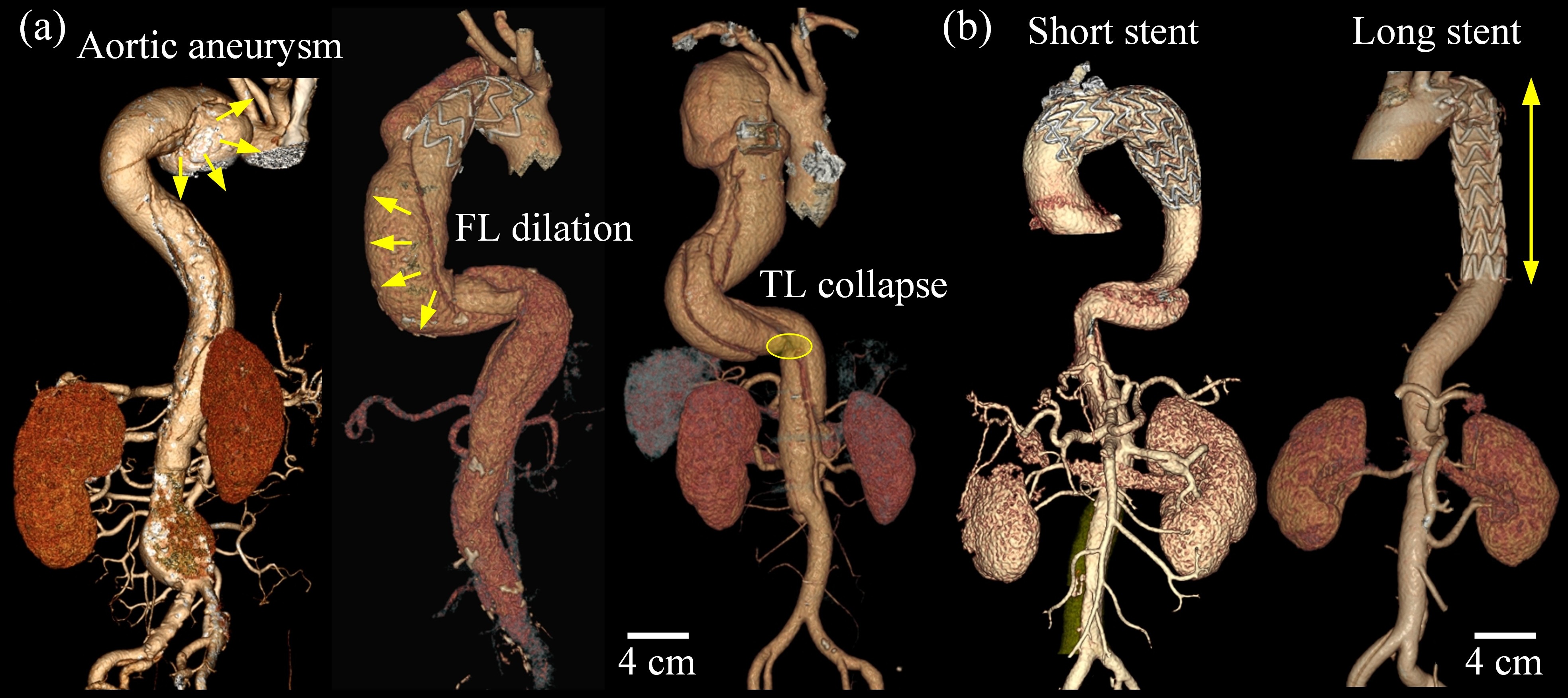 计算结果表明,胸主动脉显著的螺旋手性形貌会提高心血管不良事件发生的风险。临床随访结果表明,强手性TBAD常伴随主动脉瘤、假腔扩张等严重并发症(图6a)。针对强手性TBAD患者,研究团队建议通过植入更长的覆膜支架或裸支架改善预后效果(图6b)。