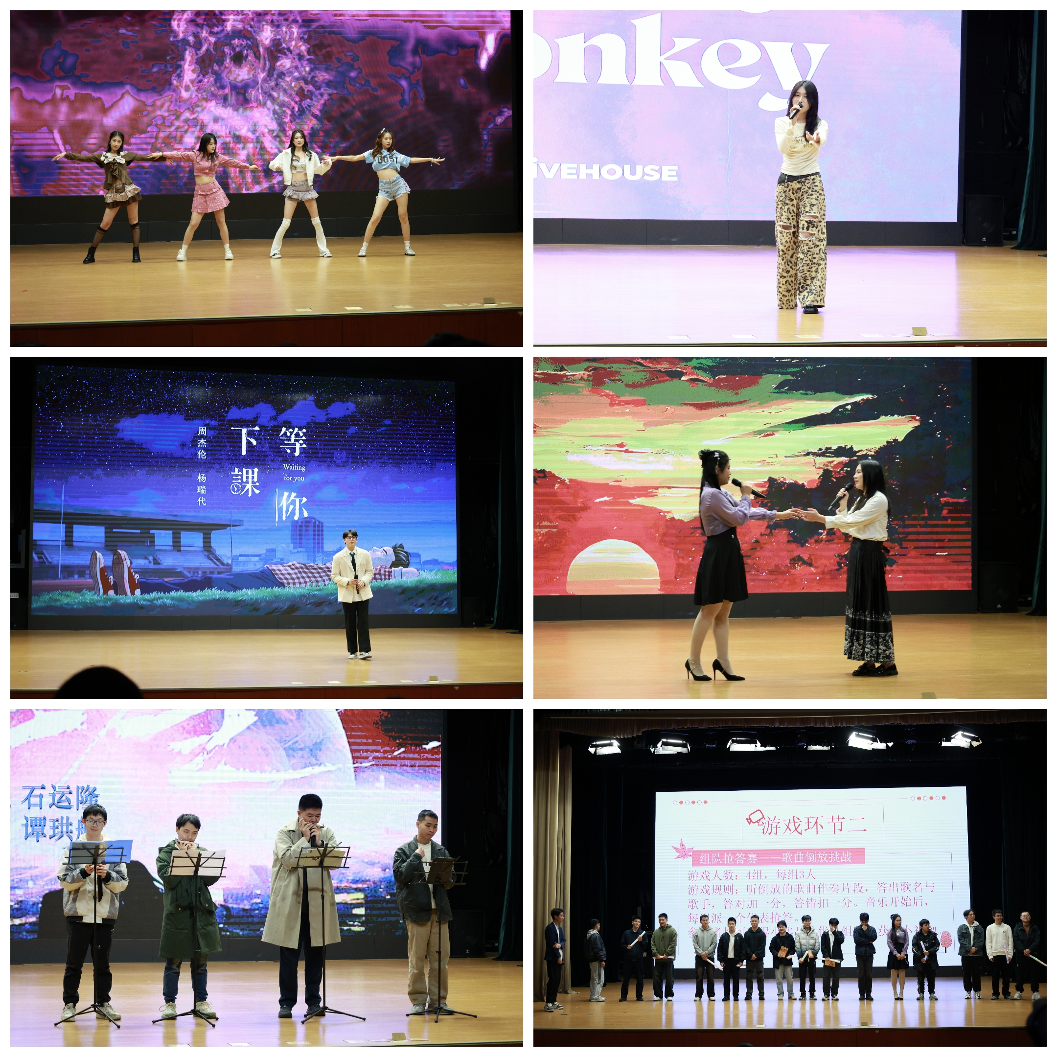 第二幕“巡航·音浪共振”中,王紫婧、武小奇、张雪芮、杜雨欣带来《Forever Young》,舞动青春活力;郭金垒演唱《等你下课》,唤起校园回忆;习宴澳明与周如仙带来《传奇》,声线交织出动人情感;星月口琴社的《尘星》旋律悠扬,刘星涵以《Dance Monkey》收尾,全场随节奏摇摆。紧接着的“歌曲倒放挑战”组队抢答赛成为当晚最受瞩目的环节。三、四两组在比赛中一度战成平手,选手们即兴展示才艺角逐胜负,歌声与笑声交织,掀起全场最热烈的欢呼。