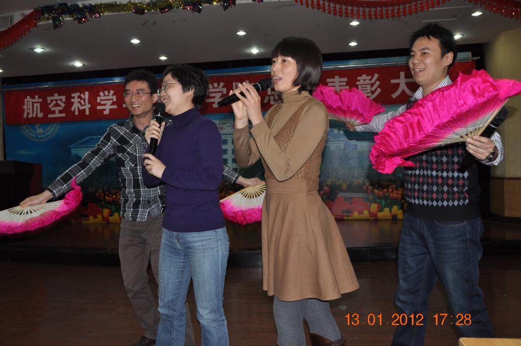 随后举行了新春联欢会。联欢会由青年教师潘翀和钟国主持,联欢会在离退休老师舞蹈团的荡裙舞中拉开序幕,乒乓球协会和羽毛球协会老师的一首《红梅赞》瞬间将我们带回到了那段峥嵘岁月。由人机环刘猛老师编写,高红霞老师等演绎的三句半将联欢会带入高潮,三句半将凯发 以及学校一年来的重大事项生动串联起来,道出了目前青年教师在科研、教学面临的现实压力,而他们又是如何以积极的心态笑对人生,现实、生动地描述催人奋进。青年教师的一首《相亲相爱》唱出了航院教职工相聚的欢乐和全院上下团结一心的亲情,联欢会在凯发 合唱团的《军民团结一家亲》和《在灿烂的阳光下》落下帷幕。联欢会还设置了抽奖和游戏环节,全场形成了良好的互动,整场联欢会在愉快、温馨的气氛中结束。