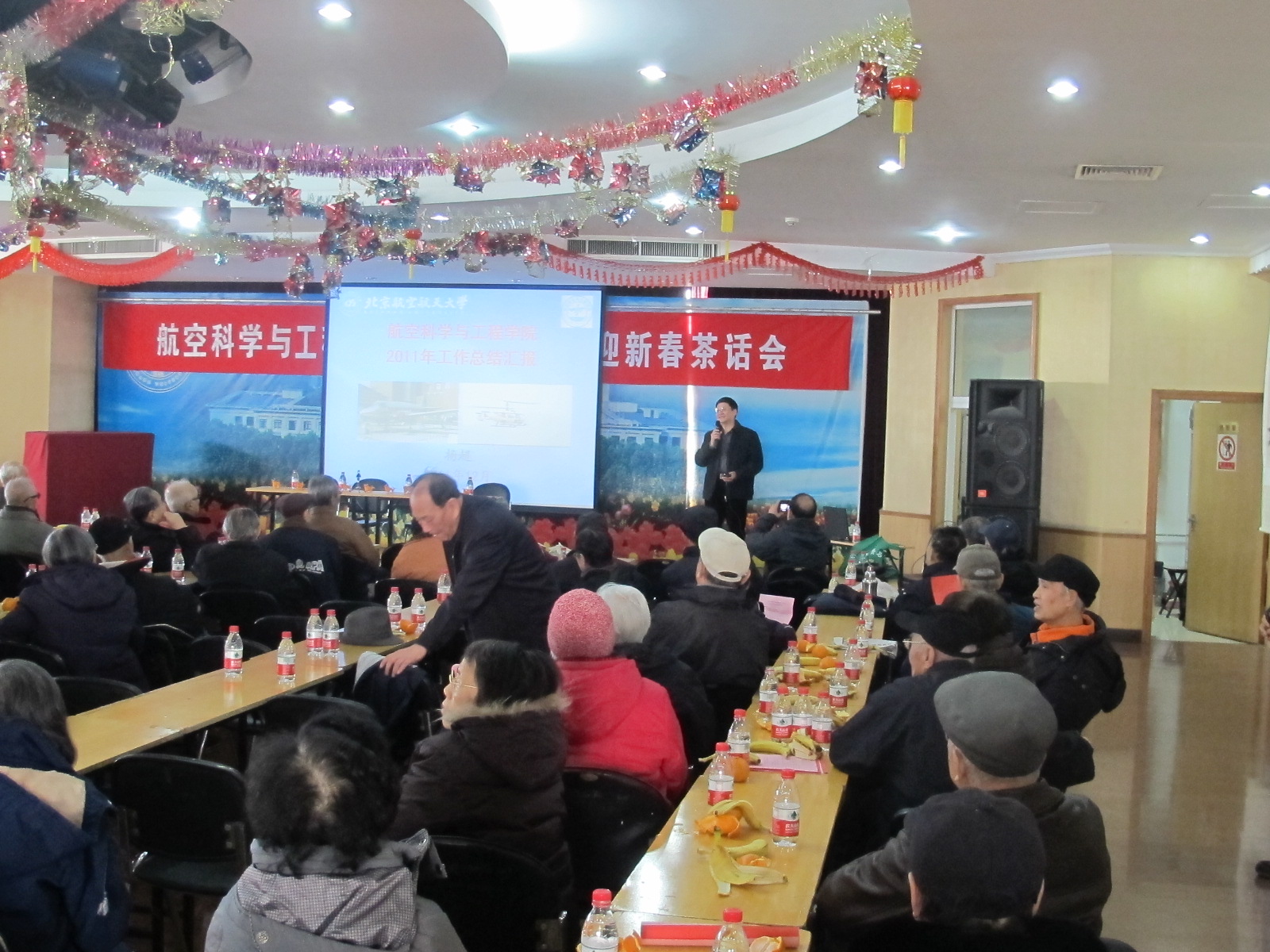 离退休教职工茶话会在思源楼多功能厅举行。多功能厅两边摆放着书画小组、手工工艺小组的书画、手工作品,还有健身、太极拳协会的活动展板、照片等,显得非常喜庆、祥和。
