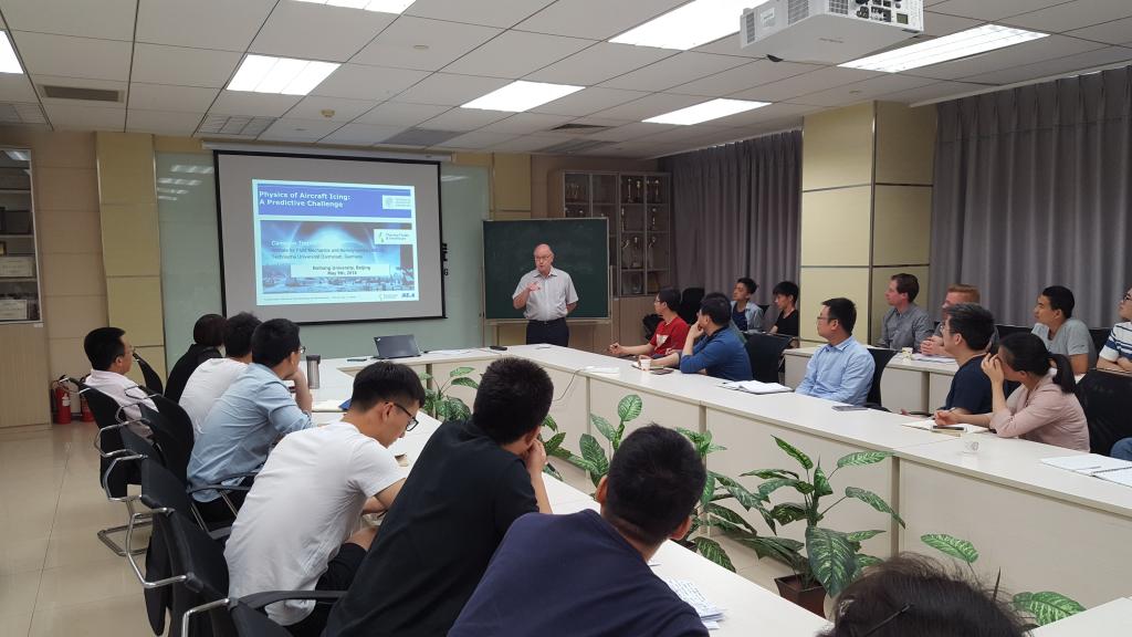 在访期间,Tropea教授做了题为“Physics of Aircraft Icing: A Predictive Challenge”的学术报告。报告中,Tropea教授介绍了飞机结冰原理,指出飞机结冰原理要可以分为两个方面:一方面由高空冰晶造成,另一方面由过冷液滴造成。高空冰晶会使发动机结冰,从而导致发动机功率损失和叶片损坏;过冷液滴会使飞机机翼等部件结冰,从而使飞机的升力降低、阻力增大。Tropea教授进一步展开介绍了飞机结冰机理研究方面的问题和挑战。报告最后,在场的老师和同学与Tropea教授就感兴趣的问题展开了热烈的讨论和交流,参会人员受益匪浅。