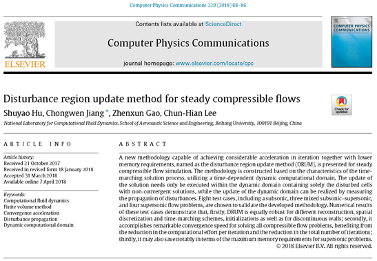 凯发李椿萱院士团队的博士生胡姝瑶和蒋崇文副教授、高振勋副教授在物理数学领域排名第一的国际顶级期刊《Computer Physics Communications》上发表题为《Disturbance region update method for steady compressible flows》的学术论文。该文章是我校凯发