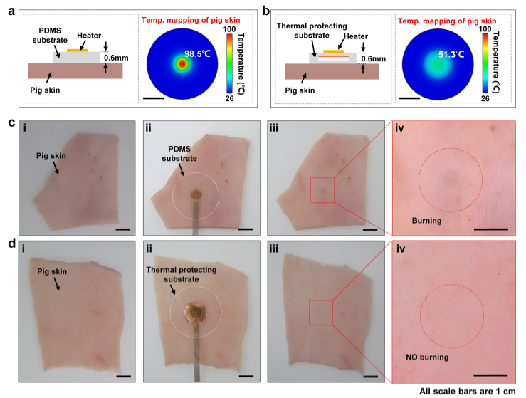 为了验证功能性柔性复合材料作为柔性热防护基底的热防护效果,研究了可穿戴柔性电子器件/新鲜猪皮系统的传热特性,经过对比得到直观的降温效果(图2)。对于传统基底,加热40s以后新鲜猪皮上有明显的烫伤的疤痕痕迹。而对于柔性热防护基底,新鲜猪皮在相同的加热条件下由于受到热防护基底的良好保护,加热后无明显变化。这一结果清楚地表明,该工作提出的功能性柔性复合材料在生物组织热防护方面具有显著的性能。
