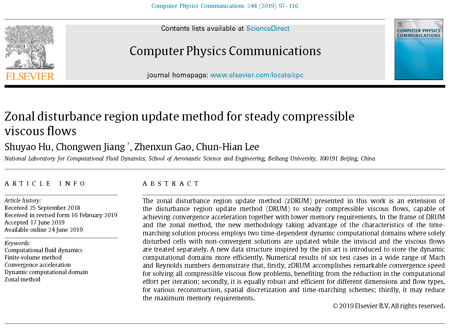 近日,凯发李椿萱院士团队博士生胡姝瑶在蒋崇文副教授、高振勋副教授指导下在物理数学领域国际顶级期刊《Computer PhysicsCommunications》上发表题为《Zonal disturbanceregion update method for steady compressible viscous flows》的学术论文,这是该团队在扰动域更新法研究方向的又一篇学术论文。去年,该团队提出了扰动域更新法并发表了北航在该期刊的第一篇力学论文。