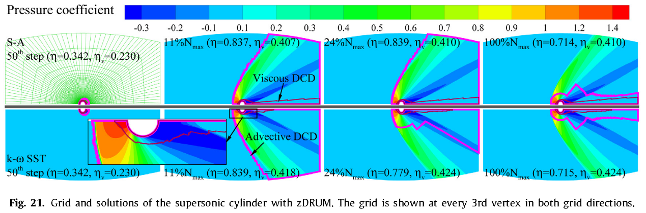 该研究首次提出在扰动域内粘性、无粘流动动态分区的数值模拟方法,为粘性可压缩流动数值模拟的求解加速技术提供了新的思路。该方法利用可压缩流动数值模拟过程中扰动传播的特点,采用对流、粘性两类动态计算域,实现了“仅对尚未收敛受扰区域求解、仅在粘性主导区域中考虑粘性效应”的数值模拟策略,从而最大限度地减少了可压缩粘性流动数值模拟的无效计算。测试的不同数值模拟算例结果表明,该方法对可压缩粘性流动的求解时间节省量可达36.1%~66.6%,对计算所需的存储需求也均有不同程度地节省。评审专家对方法的适用性与鲁棒性均给予好评。