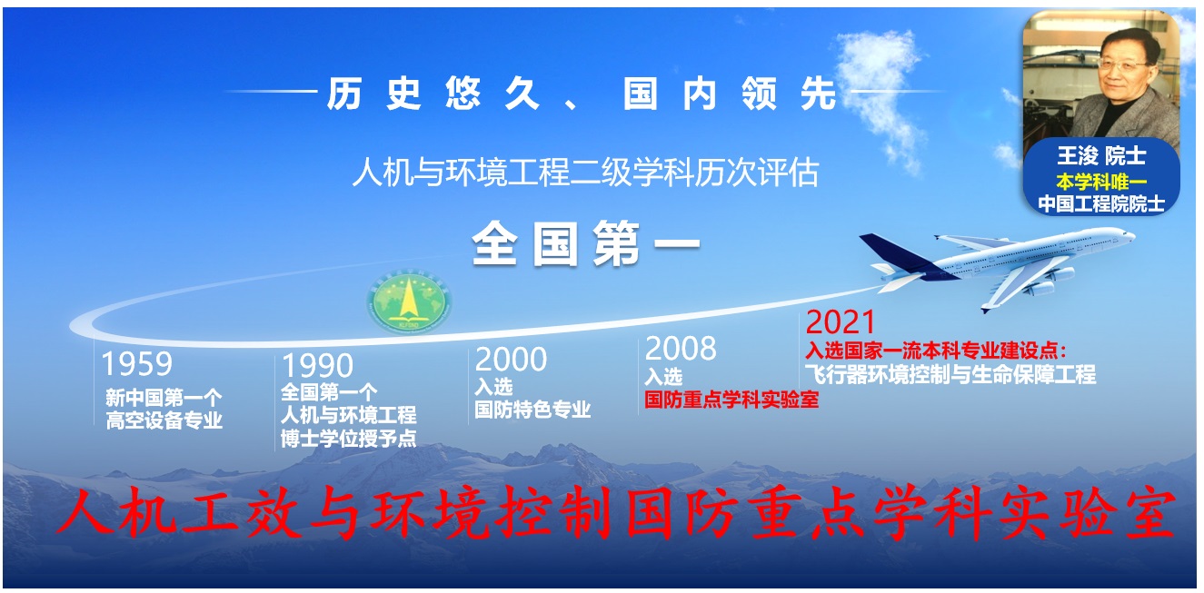 人机与环境工程系目前支撑“人机与环境工程”、“制冷及低温工程”两个二级学科。于1981年获批“人机与环境工程”硕士学位授予权,于1990年获批成为全国第一个“人机与环境工程学科”博士学位授予点,属于“航空宇航科学与技术”的二级学科。2001年至今,人机与环境工程学科为该领域国家唯一重点学科。2008年获批人机工效与环境控制国防重点学科实验室。2021年,本科专业“飞行器环境控制与生命保障工程”入选国家一流本科专业建设点。