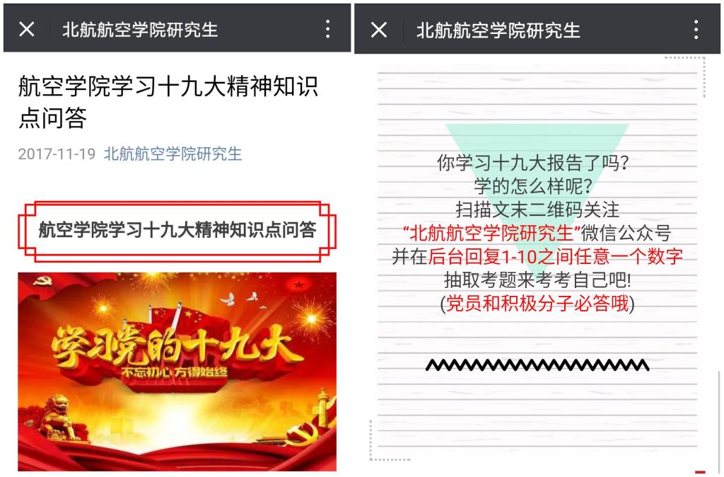 为深入学习贯彻党的十九大精神,以研究生党员喜闻乐见的形式促进十九大精神内化于心,进一步激发研究生党员的学习热情,“星火”研究生党建工作坊于2017年11月19日—24日,依托微信公众号平台,以在线答题的形式,开展“学习十九大精神知识点问答”微信答题活动。