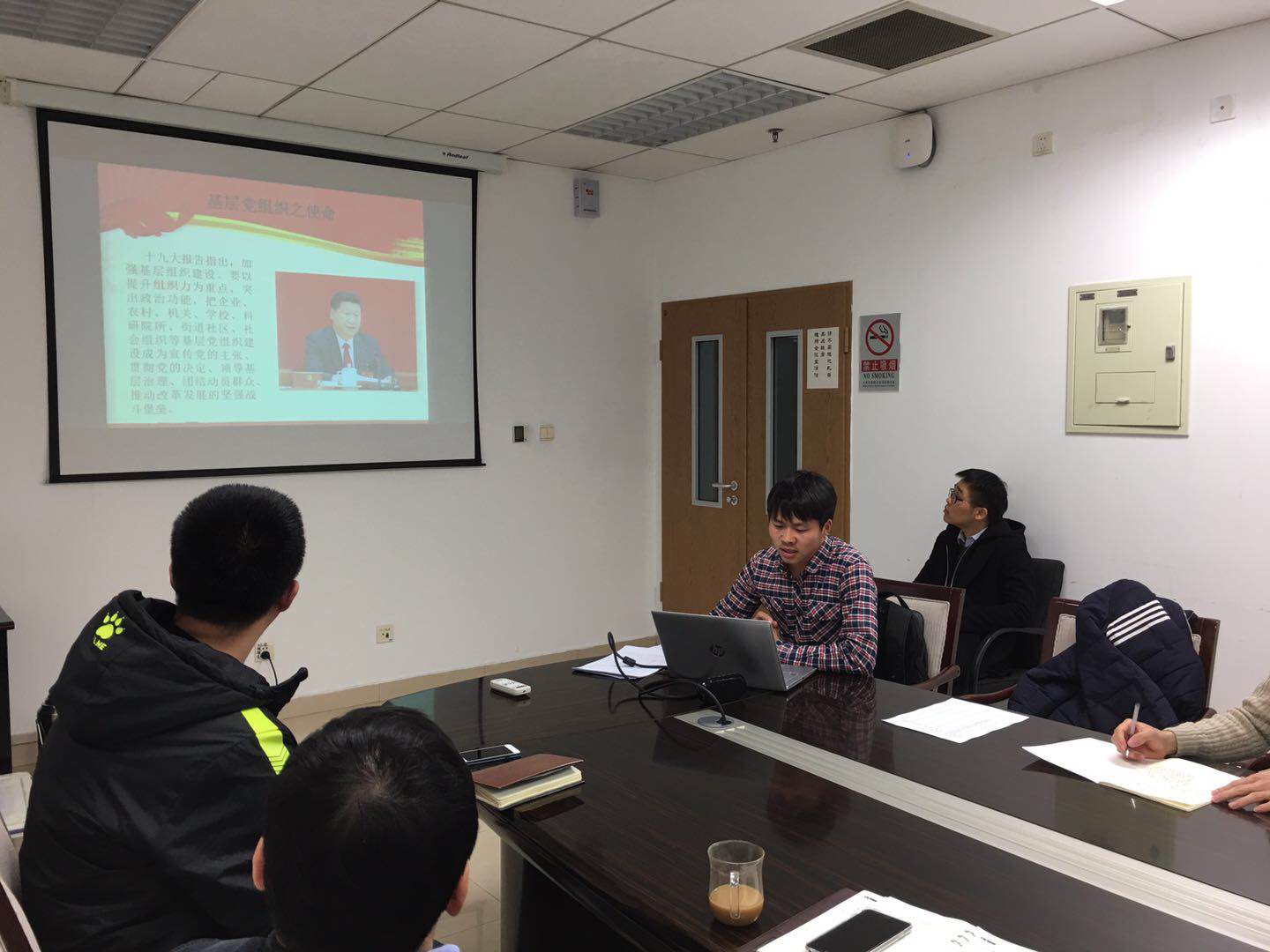 本次会议的主要内容为专题组织生活会及民主评议党员、党员分享学习体会、党支部2018年度工作计划及林书记讲话等。会议在嘹亮的国际歌声中开始,随后崔二强和王凯钥同志为大家分别做了题为《十九大中的“八个明确”和“十四个坚持”》和《深入学习党章,做合格党员》的报告。崔二强同志为大家阐释了习近平总书记在十九大报告中提出的“八个明确”和“十四个坚持”的深刻含义。而王凯钥同志则阐释了党章中规定的党员八项义务,解释了习近平新时代中国特色社会主义思想和遵守政治纪律和政治规矩的五个方面的要求,以及我们基层党组织的基本任务等。