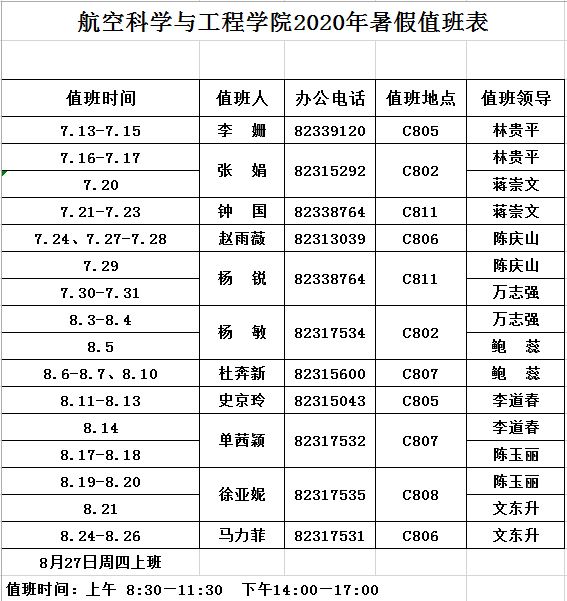 凯发 2020年暑假值班表(7月13日-8月26日)