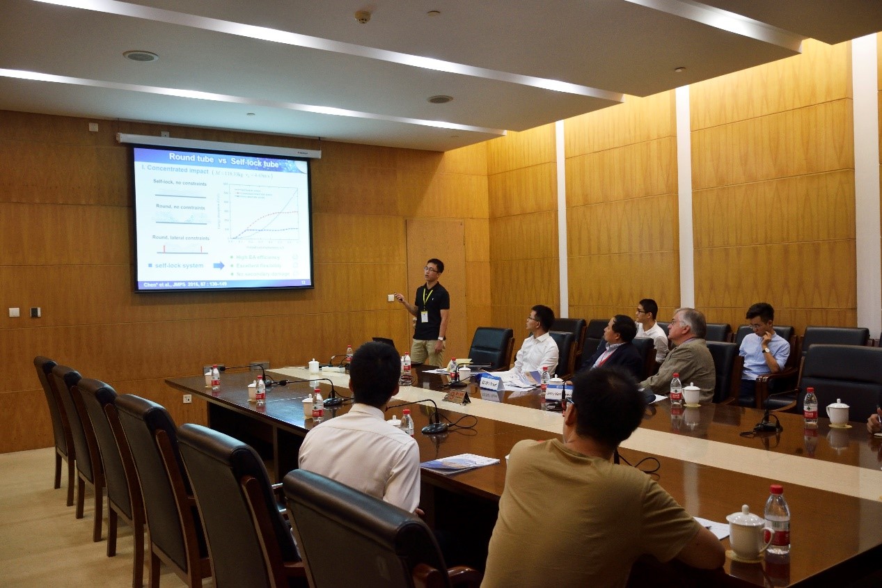 杨奎坚的报告题目是《A NovelSelf-locked Tube System for Energy Absorption》。严重的事故会造成重大的财产乃至生命损失,因此冲击防护十分重要。能量吸收系统广泛用于保护生命和财产免受冲击载荷。一个优良设计的能量吸收系统应该能够:1)高能量吸收效率 2)良好的灵活性——易于组装和修改 3)没有二次伤害。