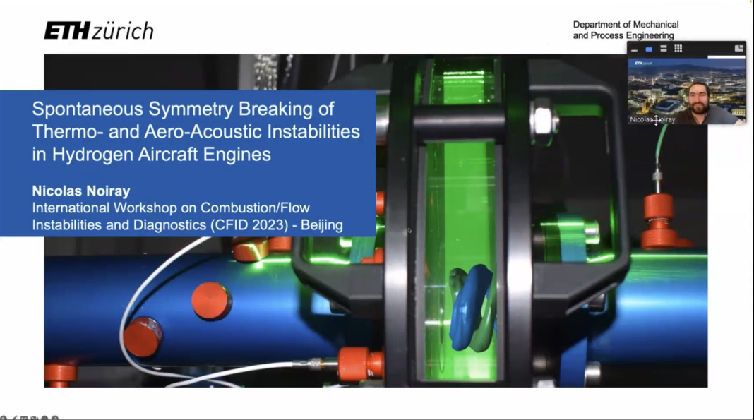 的Nicolas Noiray教授以《Spontaneous symmetry breaking of thermo- and aero-acoustic instabilities in hydrogen aircraft engines》为主题,对燃气轮机燃烧室采用氢气为燃料时不稳定性自发性对称破缺问题进行了报告。