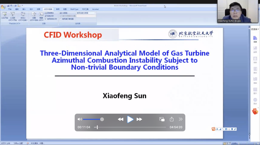 的孙晓峰教授以《Three-dimensional analytical model of gas turbine azimuthal combustion instability subject to non-trivial boundary conditions》为主题,围绕燃气轮机与航空发动机中的热声不稳定性的三维解析解模型问题,进行了本次研讨会的第一个报告。