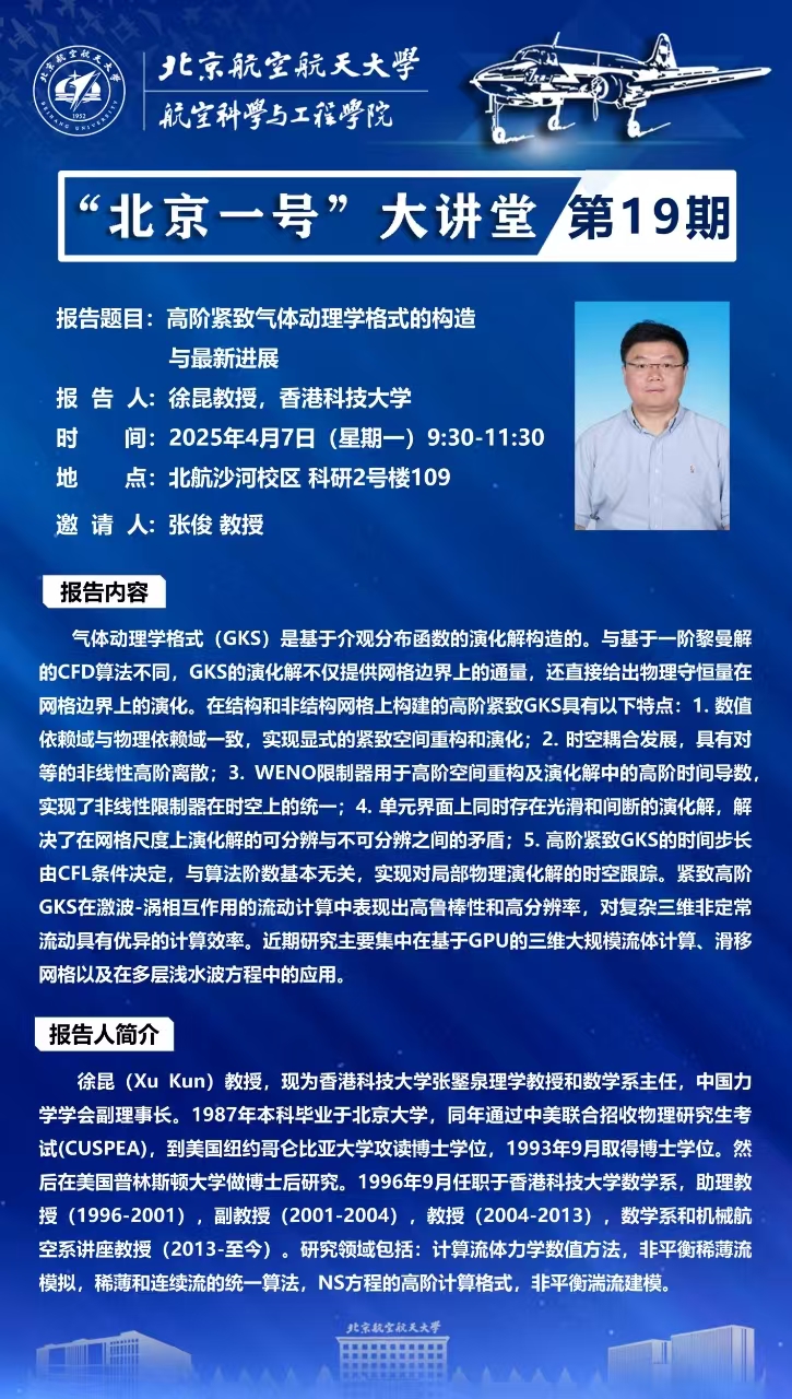 徐昆(Xu Kun)教授,现为香港科技大学张鋻泉理学教授和数学系主任,中国力学学会副理事长。1987年本科毕业于北京大学,同年通过中美联合招收物理研究生考试(CUSPEA),到美国纽约哥仑比亚大学攻读博士学位,1993年9月取得博士学位。然后在美国普林斯顿大学做博士后研究。1996年9月任职于香港科技大学数学系,助理教授(1996-2001),副教授(2001-2004),教授(2004-2013),数学系和机械航空系讲座教授(2013-至今)。研究领域包括:计算流体力学数值方法,非平衡稀薄流模拟,稀薄和连续流的统一算法,NS方程的高阶计算格式,非平衡湍流建模。