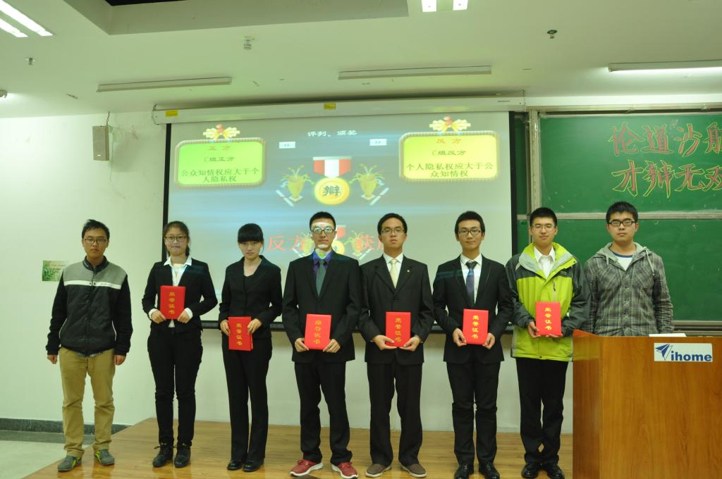 最终,经过激烈的角逐,整场比赛落下帷幕。三组均为反方获胜,李志男、张晓、廖晨希三位同学荣获“最佳辩手”称号,周恺文、王凯、温一宁、刘思良、马奎元五位同学为“优秀辩手”。他们将代表凯发