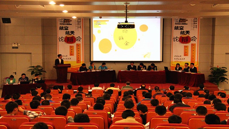 、清华大学、北京理工大学担任。论辩环节中,三方分别抽取了“无人机送快递的可行性”、“未来空战是否会由超视距空战回到格斗空战”以及“人形机甲是否会成为未来飞行器的发展方向”三个论题,并由此展开论辩。在论辩过程中,三所高校的同学们都展示出他们的雄辩的自信和魅力。他们引经据典,对于近代具有代表性的大规模空中战争的分析详细而深刻,对于航空航天未来的发展具有自己独特的理解,对于高科技带给人类社会的裨益与危害能够全面认识,从不同角度、不同方面给予了论题精彩的阐释。言语的交流与碰撞中不时闪出智慧的火花,滔滔的雄辩之中展露出当代大学生精神饱满的气质。