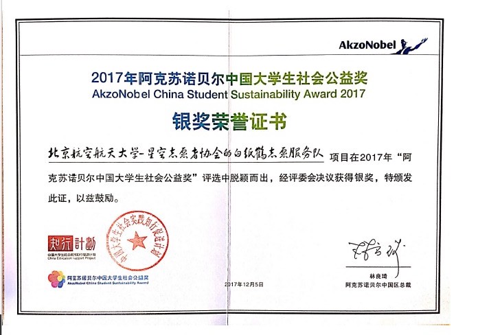 作为协会负责人,郑妍同学积极探索志愿服务新模式,成立北航首支以医疗关怀为主的志愿服务团队——白纸鹤志愿服务队,服务队配合校医院宣传健康知识、搭建知识共享区、编写健康知识手册、维护校医院微信公众号,为建设健康北航的目标而努力。该项目运营期间,校内本研学生广泛参与、积极响应,截止目前共有超过1000人次参与该志愿活动,在北航的土地上播撒了志愿精神火种,同时,服务队良好的服务态度、志愿者们无私奉献的精神风貌得到了校医院医生和前来就诊、体检的教职工中的好评。该项目于2017年荣获共青团中央学校部“中国大学生社会实践知行促进计划”核心项目——“阿克苏诺贝尔中国大学生社会公益奖银奖”,这是目前北航在该项目中获得的最高等级奖项,星空志愿者协会也是校内首个获得该奖项的研究生社团。