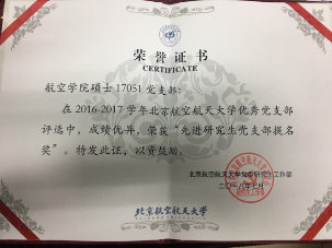 “标兵党支部”、北航“先进研究生党支部”提名奖、北航研究生B类党创基金3项荣誉,支部更致力以党建带班建,所联系的SY17052班、SY17053班均获评北航“优秀研究生班集体”一等奖。