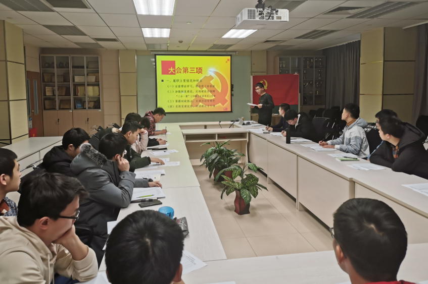 大会开始,首先由书记张山同志为全体党员复习回顾习近平新时代中国特色社会主义思想的党课内容,加深同志们理论学习的印象与深度。理论学习后,由支部书记张山代表支委向全体支部党员进行述职,总结一年来支部工作的成果和不足,之后进行支委述职,组织委员董仲阳、宣传委员瞿晓东、纪律委员闫安三位支部委员不仅介绍了各自一年来所做的工作还全面剖析了自身工作中的不足。述职结束后,由全体支部党员对支部班子的工作情况进行民主评议。本次支委述职既增加了同志们对支委工作的了解又加深了支委们与支部同志的沟通,有利于未来支部工作的展开与支部同志与党支部班子的配合。
