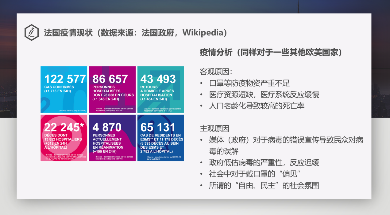 2019级研究生党支部党员王泽远同志为大家介绍了法国疫情现状及防控措施。他以一个中国留学生的视角,为大家讲述了自己在巴黎疫情期间的生活状态,使大家更加全面地了解了法国疫情期间的公共卫生、出行交通、防疫物资、学校现状以及日常生活等方面的情况。王泽远同志对比了法国和中国的封城措施,从客观和主观两个方面分析了法国政府没有很好地把握住中国为世界抗疫创造的窗口期而导致感染人数激增的原因。最后,王泽远同志与大家分享了自己对疫情背后中法关系的看法,向大家讲述了自己遭受个别法国民众的人身攻击的经历。