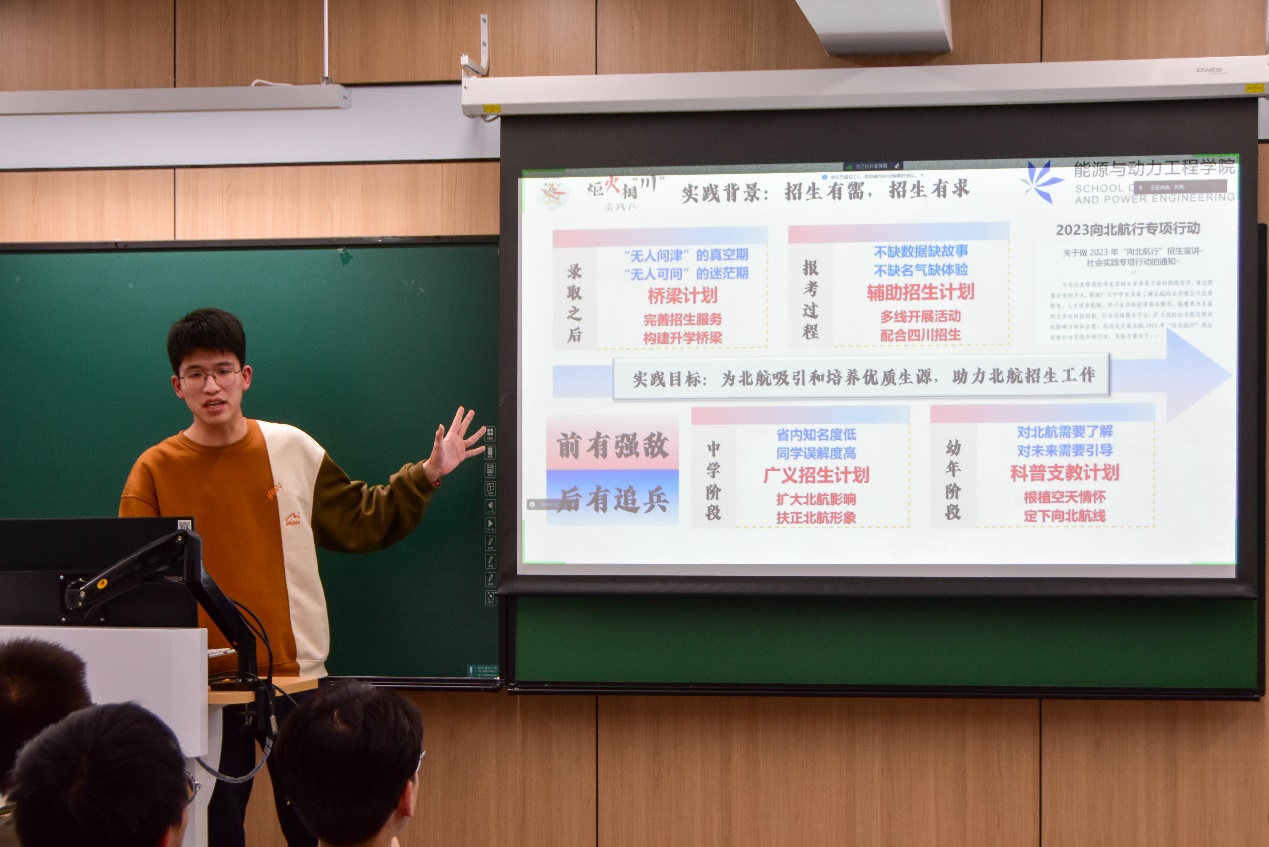 炬火相“川”实践队队长张峻彩以“打造链式招生,领航一路华章”为主题讲述北航故事,积极开展科普支教,多维度的将招生宣讲这一实践活动展示给大家。