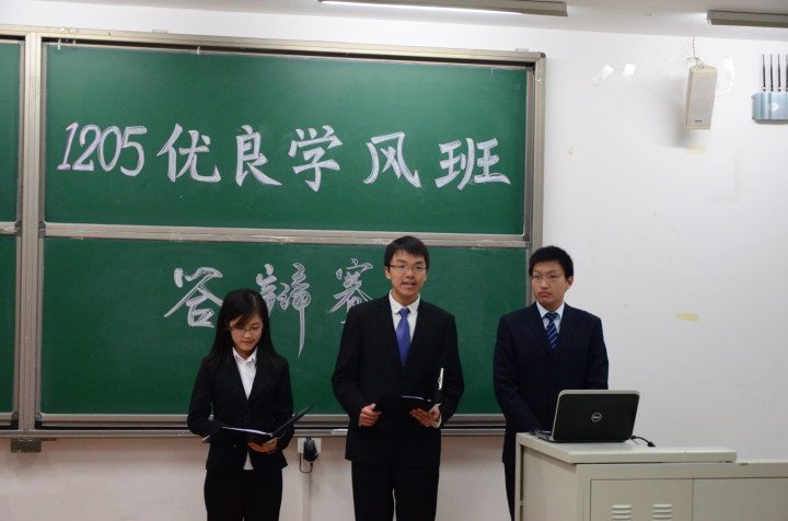 答辩现场 评委在提问 汪洲进行点评和经验交流 吴迪评委为获奖班级颁奖 参加答辩班级代表与评委们合影 2013年10月27日,北航1205大班优良学风班答辩在沙河校区三号教学楼2...