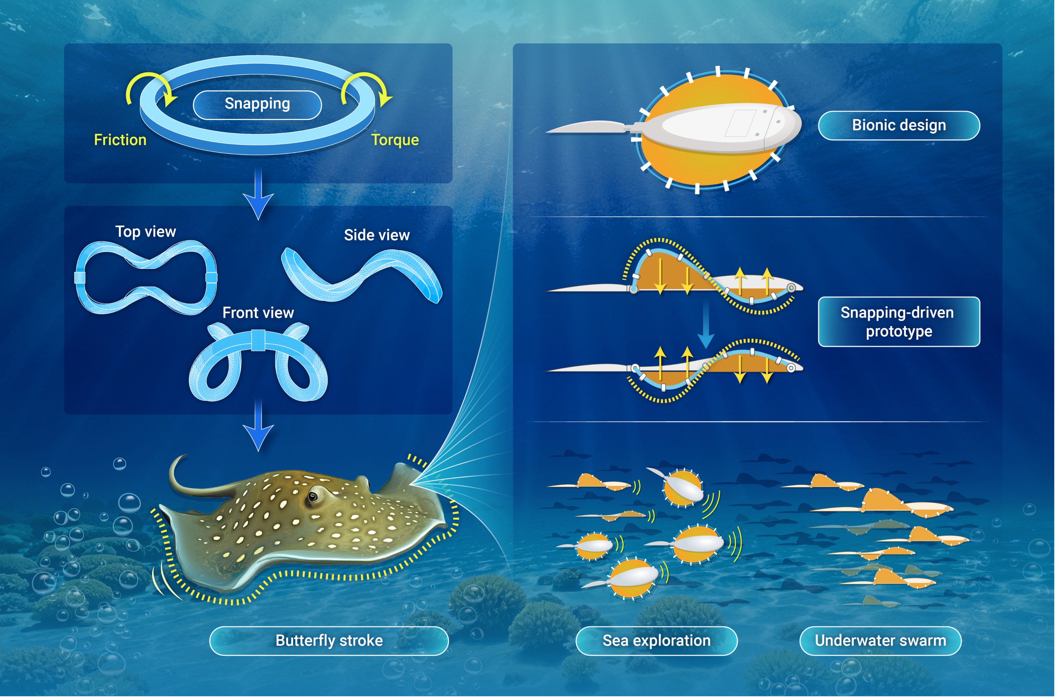 近日,凯发赵子龙教授及其合作者在综合类顶级期刊《The Innovation》(中科院分区1区;影响因子:25.7;引用分:53.4)发表论文《Robotic ray driven by periodic ring snapping》。他们从蓝斑条尾魟优雅的泳姿中获得灵感,提出了新颖的水下驱动方式,研发出高效、稳定且隐蔽的仿生软体机器鱼。这项成果在海洋探测、水下机器人等领域有潜在的应用价值。 在游动时,蓝斑条尾魟的胸鳍发生低频周期性波动变形(图1)。与尾鳍推进...
